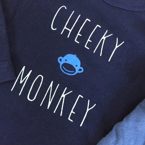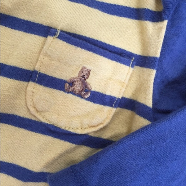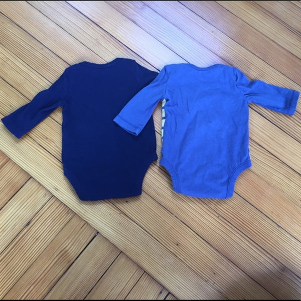 Baby Gap Long-Sleeve Bodysuit Bundle. Baby boy size 0-3 months. Long-sleeve onesie tops are a staple for a fall and winter wardrobe! Each was worn just once or twice. Navy blue shirt says "CHEEKY MONKEY" in white and has a light blue monkey face. Other body suit is a lighter blue with a mustard yellow body with thin blue stripes. Chest pocket has a little bear!