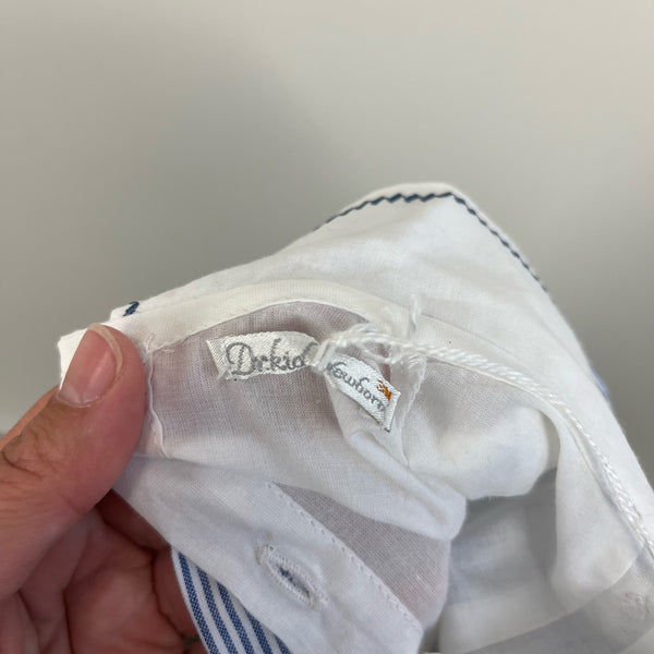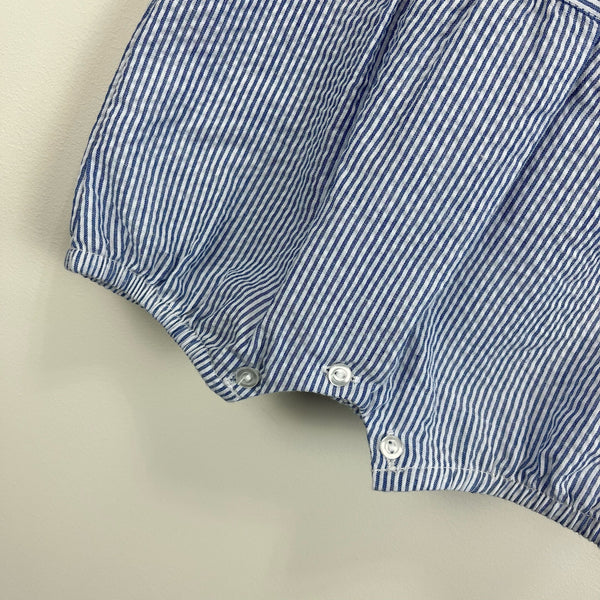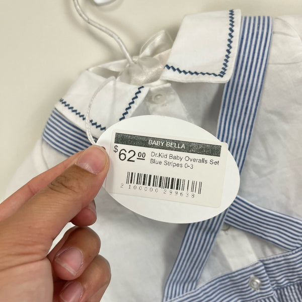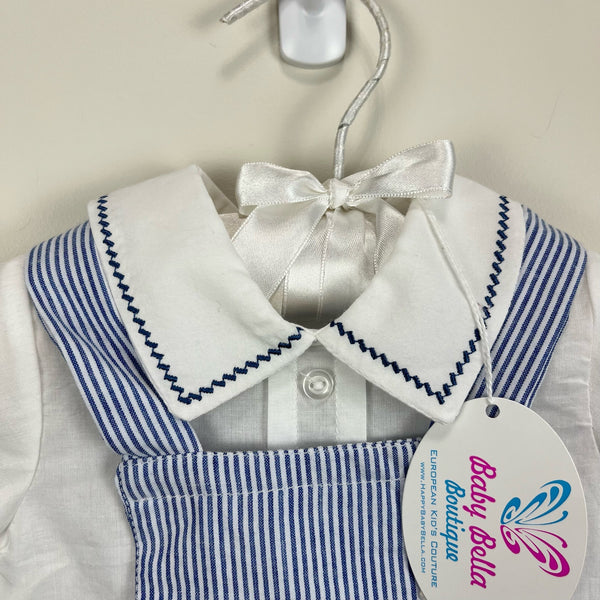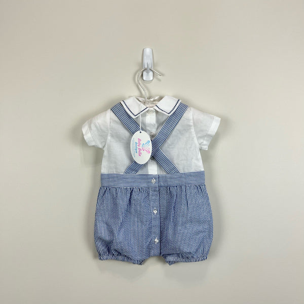 Dr. Kid Blue Striped Shortall Romper Set. Baby boy size newborn. Brand new with tag (NWT). Traditional blue and white striped summer overalls with matching short sleeve collared shirt. From Portuguese designer.
