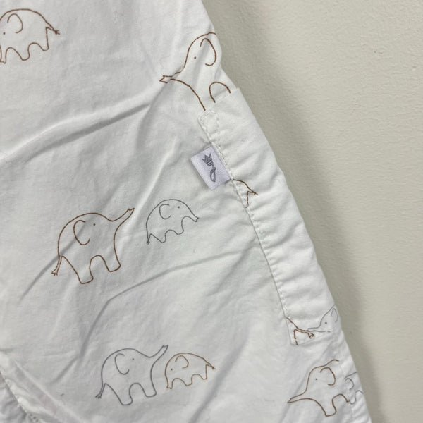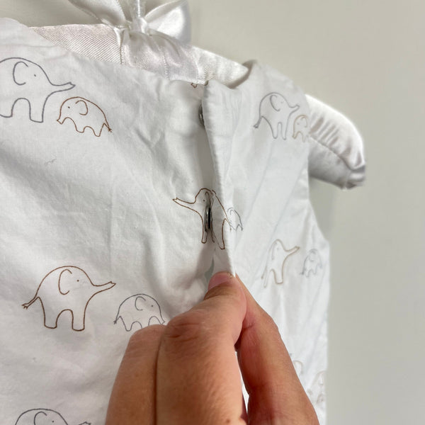 Jacadi Paris White Elephant Shortall Romper. Baby boy or girl size 3 months. Sleeveless one piece outfit with gray and tan elephant outline print. Button placket in the front and snaps in the back and at the bottom. Lined. Excellent condition.