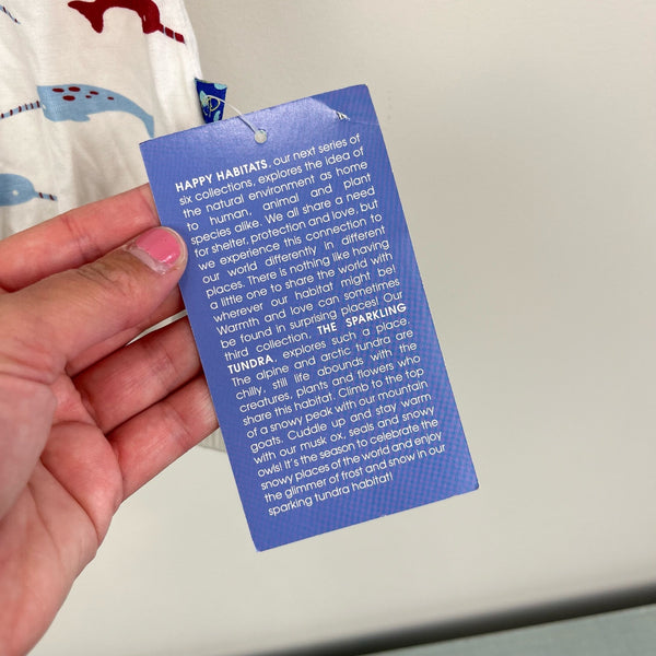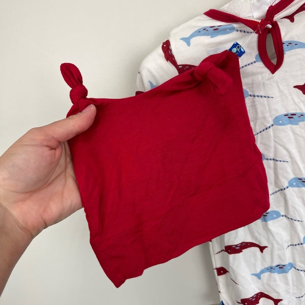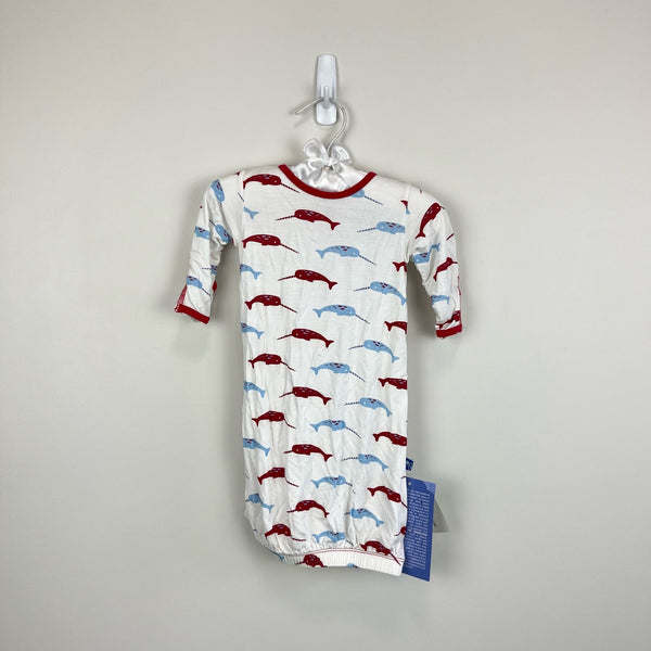 Kickee Pants Print Layette Gown & Double Knot Hat Set. Baby boy size 0-3 months. Brand new with tag (NWT), though does have a tiny mark (see last photo). Super soft and cozy. Light-weight material is perfect for a summer baby! White with nautical red and blue narwhal print. Elasticized opening at the bottom and fold over mitten cuffs.