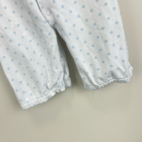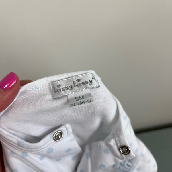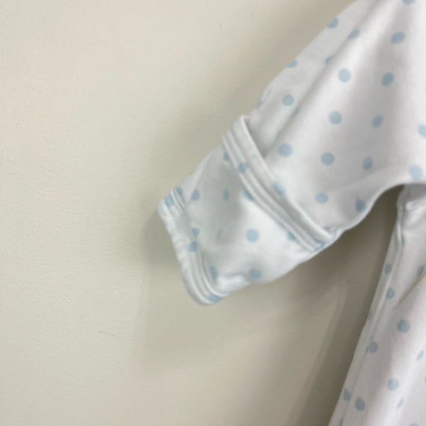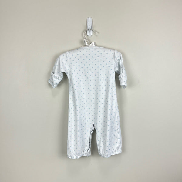 Kissy Kissy Blue Polka Dot Giraffe Converter Sleep Gown. Baby boy size small (0-3 months). White with light blue polka dot pattern and embroidered giraffe on the chest. Super soft pima cotton sleep gown conveniently converts to one piece outfit for day time play. Fold over mitten cuffs to prevent baby baby from scratching. Has a couple light marks (see last two photos). A must-have for any newborn wardrobe!