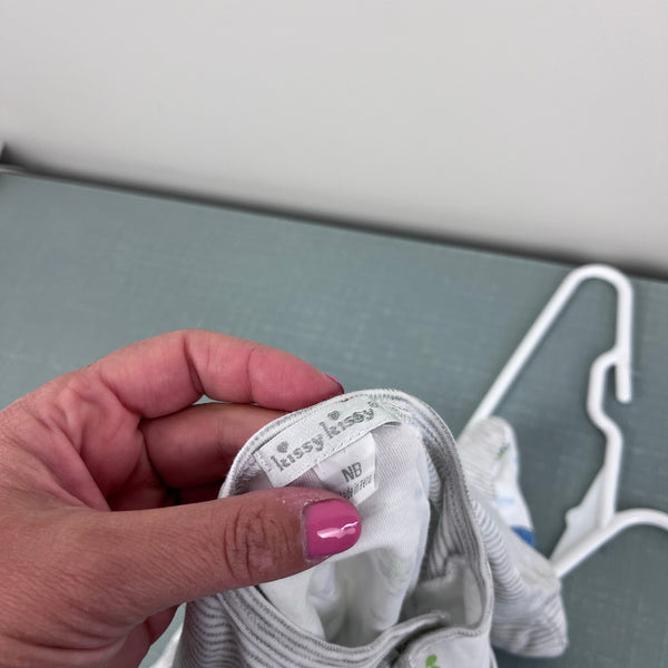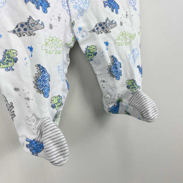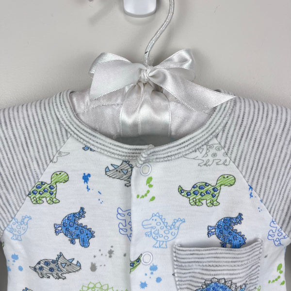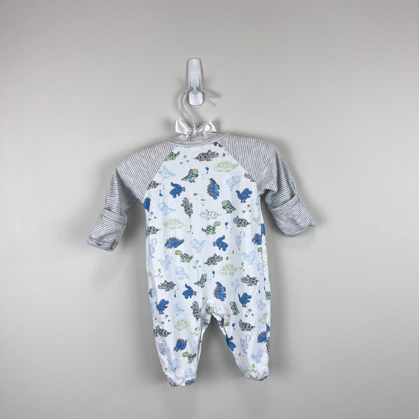 Kissy Kissy Dinosaur Footie Coverall. Baby boy size newborn. Super soft pima cotton one piece outfit is perfect for sleep or play. White with blue and green dinos and gray striped sleeves. Fold over mitten cuffs and snaps down the front.