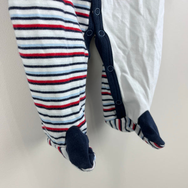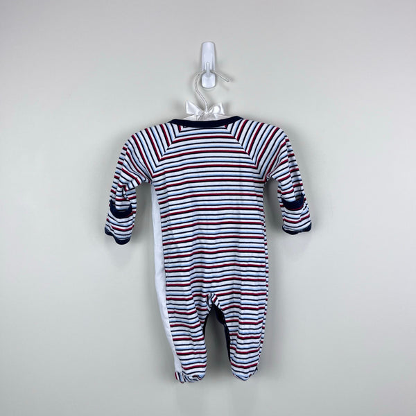 Kissy Kissy Striped Tugboat Footie Coverall. Baby boy size 0-3 months. Super soft nautical themed one piece pima cotton one piece outfit is perfect for sleep or play. White with navy, blue and red stripes and embroidered boat on the chest. Fold over mitten cuffs and crossover snap front.