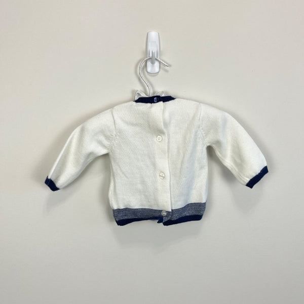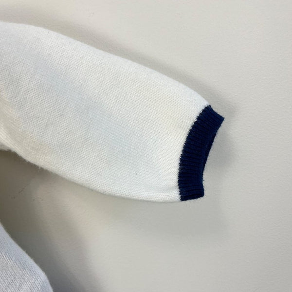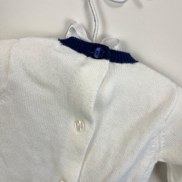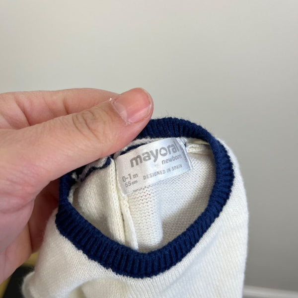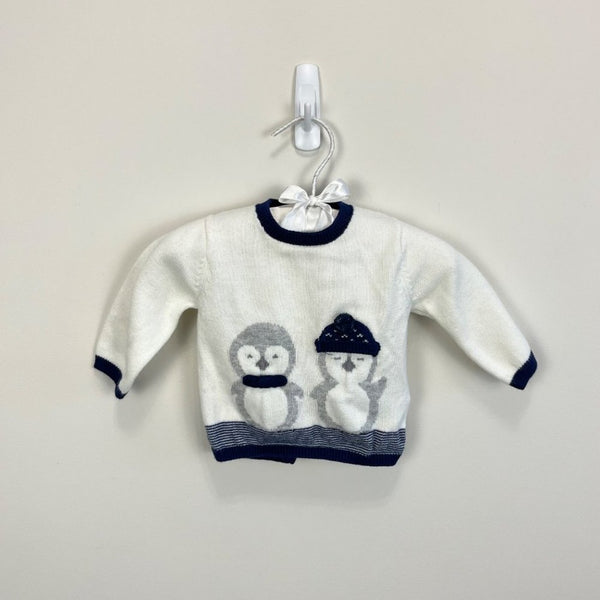 Mayoral Baby Penguin Sweater. Baby boy size 55 cm (0-1 months, US equivalent to newborn). High quality Spanish children’s brand. Soft and cozy white sweater with navy and gray penguin design. Slight wear to pom pom, but otherwise like new. Buttons all the way down the back for easy on/off.