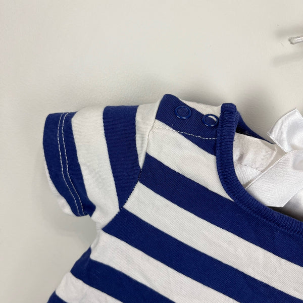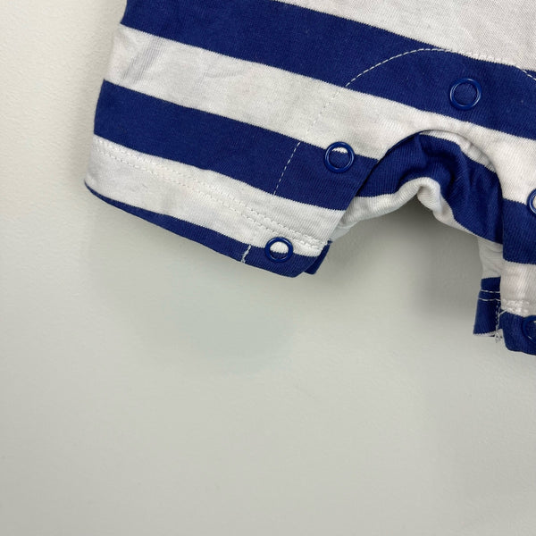 Mini Boden Striped Crocodile Applique Shortall Romper. Baby boy size newborn. Adorable one piece outfit for summer! Starboard navy blue and ivory white stripes with large croc (alligator?) along the side. Great condition!
