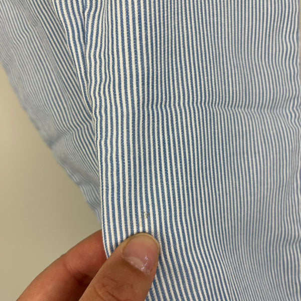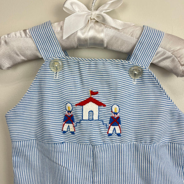 Vintage Blue Striped Guard House Overalls. Baby boy size 0-3 months. Thin blue and white stripes with embroidered toy soldiers and house on the bib. Button straps and snaps along the legs. Tiny mark (see last photo), but otherwise great condition!