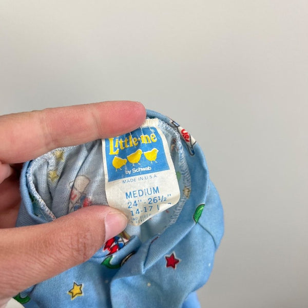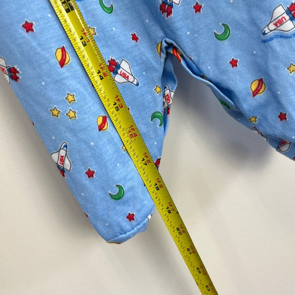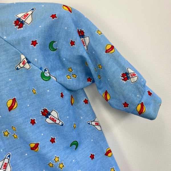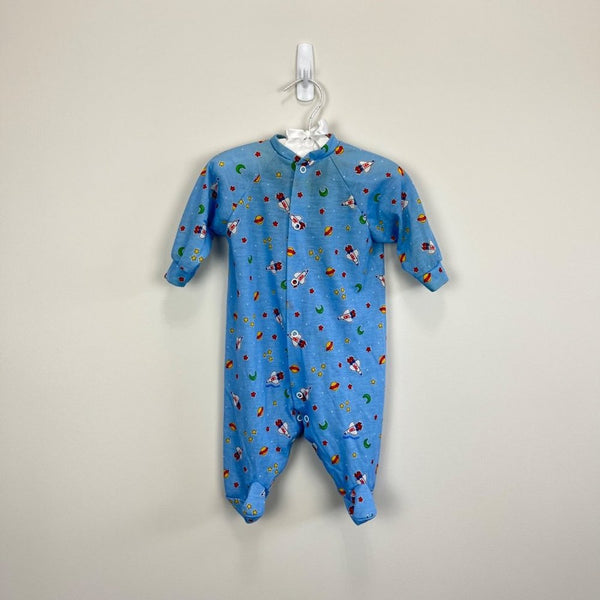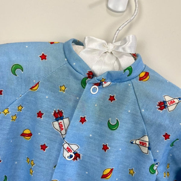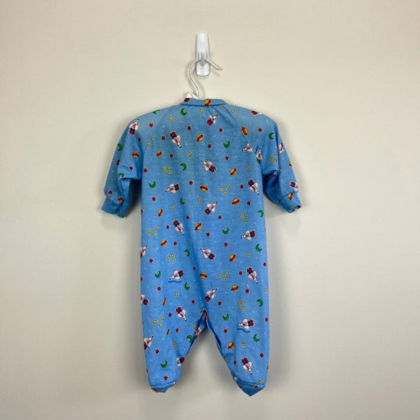 Vintage Little Me Blue Space Footie. Baby boy size medium. Looks about 6 months, but please check measurements to ensure fit. Made in the USA. Cute and cozy one piece outfit for every day sleep and play! Blue with yellow, red, and green rocket ships, stars, and moons. Slight discoloration at collar, but no other issues to note.