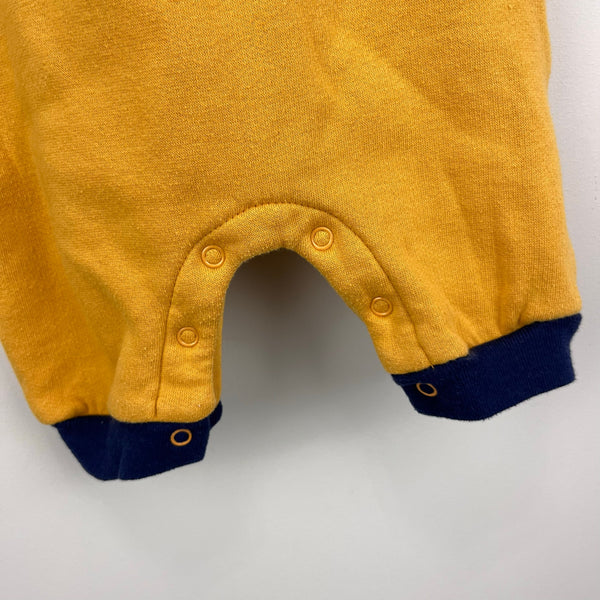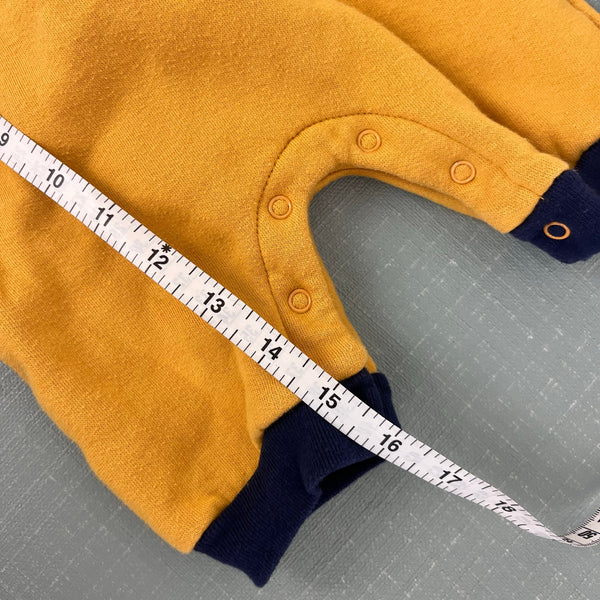 Vintage Y2K Nick Jr Blue's Clues Hooded Football Coverall Outfit. Baby boy size 0-3 months. Cozy one piece sweatsuit romper outfit. Golden yellow with navy blue. Features varsity style "03" and Blue holding a football on the chest. Snaps along the legs for easy on/off. Cozy sweatshirt material. Great condition! Copyright Viacom 2003.