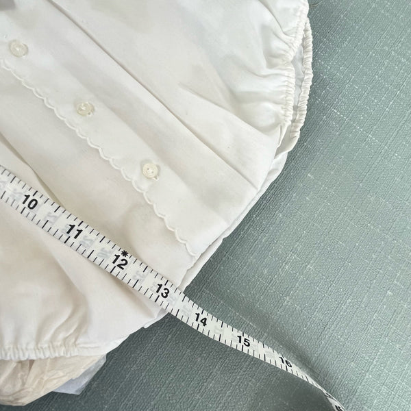 Vintage Feltman Brothers White Hand Embroidered Scallop Collar Button Belt Creeper. Brand new without tag (NWOT), though the elastic in the legs is stiff from age and there is the faintest discoloration at the top button (see photo). No size tag, but measures like baby girl or boy newborn; see size chart. Beautiful and timeless details on this one piece bubble romper. Scallop collar with embroidery Peter pan collar, scallop detail at the cuffs, pleats down the center, and button belt around the waist. Snaps at the bottom and button down the front for easy dressing. Perfect for a christening, wedding, or other special occasion!