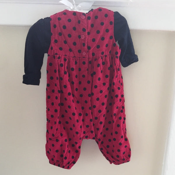 Gap Navy & Red Polka Dot Corduroy Overall Set. Baby girl size 0-3 months. Cute set is perfect for fall and winter. Long-sleeve bodysuit has large bows on each wrist. Overalls have a bow on the shoulder and snaps along the legs to allow for easy diaper changes. Fun polka dot pattern! Great condition with no flaws to note!