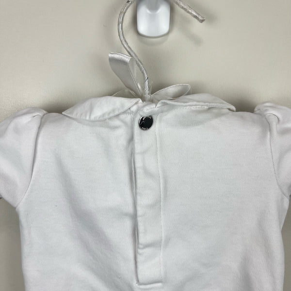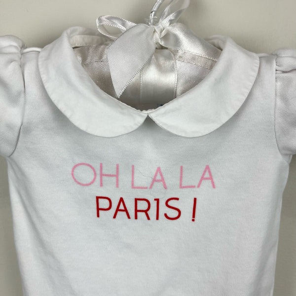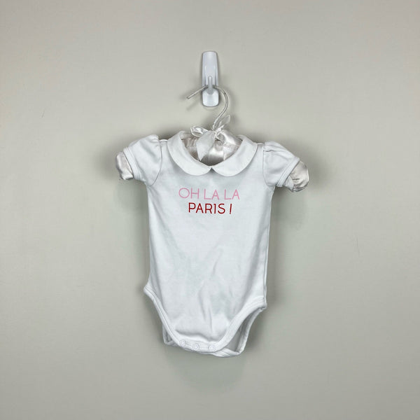 Jacadi Oh La La Paris! White Bodysuit. Baby girl size 1 month (newborn). Super soft short sleeve collared onesie. Fun pink and red print on the front. Snaps in the back and at the bottom for easy on/off. Tiny pin holes in the back, hidden under the collar (see photo), but otherwise perfect condition1