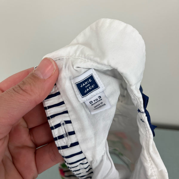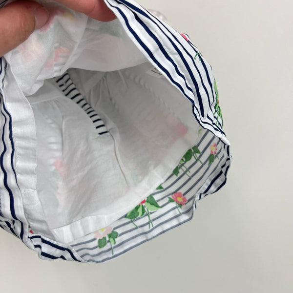 Janie and Jack Navy Striped Floral Set. Baby girl size 0-3 months. Short sleeve dress top with white collar, ribbon bow, and colorful flower print. Matching bloomers with ruffles across the bum. Excellent condition!