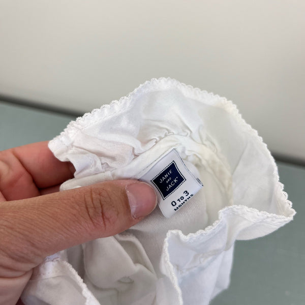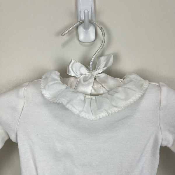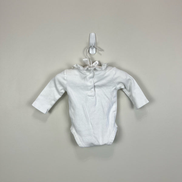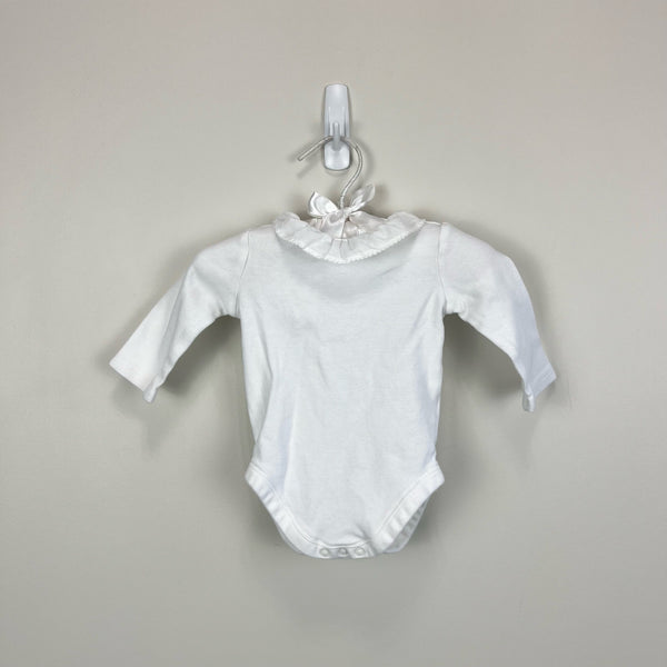 Janie and Jack Ruffle Collar Bodysuit. Baby girl size 0-3 months. Long sleeve white shirt in super soft cotton interlock. Features a dainty collar with picot trim. Perfect for dressing up a pair of overalls or pairing with jeans and a cardigan! Excellent condition.
