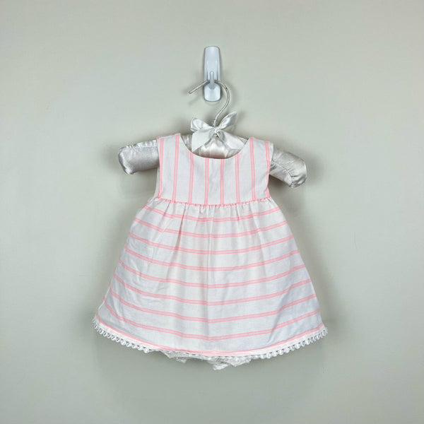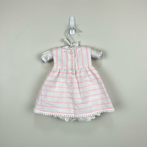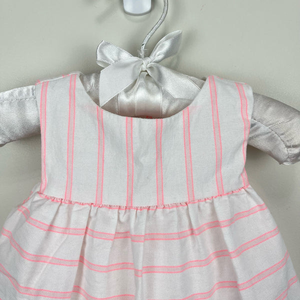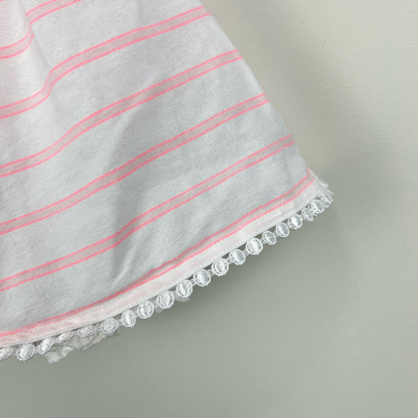 Janie and Jack Striped Skirted One Piece Romper Outfit. Baby girl size 0-3 months. Sleeveless one piece dress with built in bloomers. White with pink stripes and fun pom pom trim. Buttons in the back and snaps at the bottom. Fully lined. 54% Cotton/46% Polyester Oxford. Faint discoloration at leg (see last photo; untreated), but otherwise excellent condition.