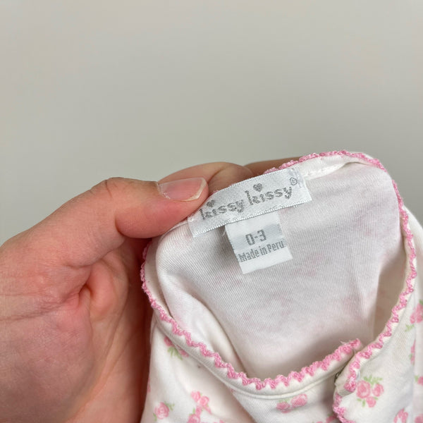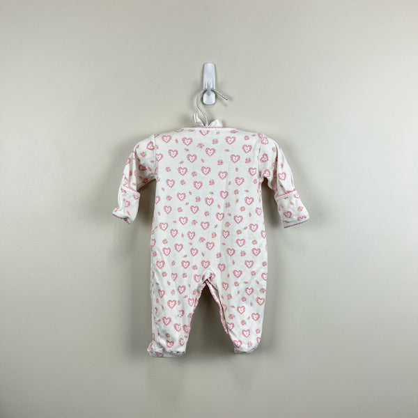 Kissy Kissy Pink White Heart Footie. Baby girl size 0-3 months. Super soft pima cotton one piece outfit. White with pink hearts. Snaps down the center for easy on/off and fold over mitten cuffs. Faint discoloration at collar (untreated; only noticed when taking close up photo). Great every day piece for sleep or play. So cute for baby's first Valentine's Day!