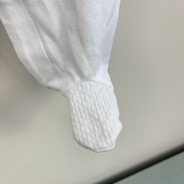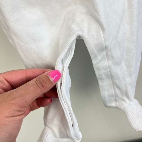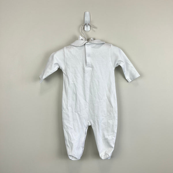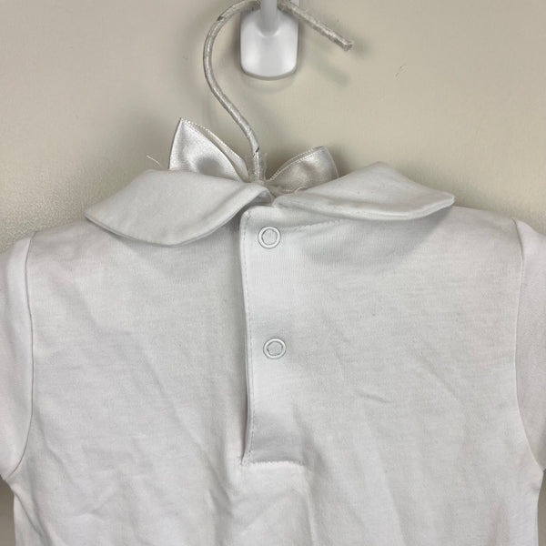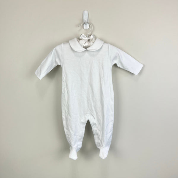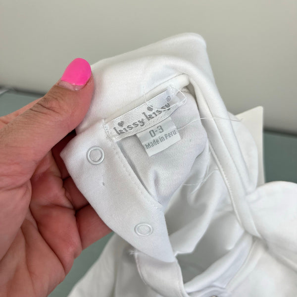Kissy Kissy Winter Solstice Footie with Collar. Baby boy or girl size 0-3 months. Brand new with tag (NWT). Simple, yet elegant one piece footed coverall outfit. Bright with with crochet detail on the feet. Peter pan collar. Buttons in the back and along the legs.