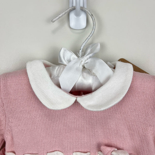 Mayoral Rose Knitted Bow Romper. Baby girl size 2-4 months. Brand new with tags (NWT). Gorgeous one piece footed sweater outfit. Light pink top with peter pan collar and peplum ruffle hem. Buttons in the back.