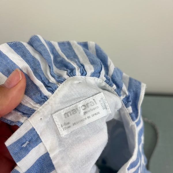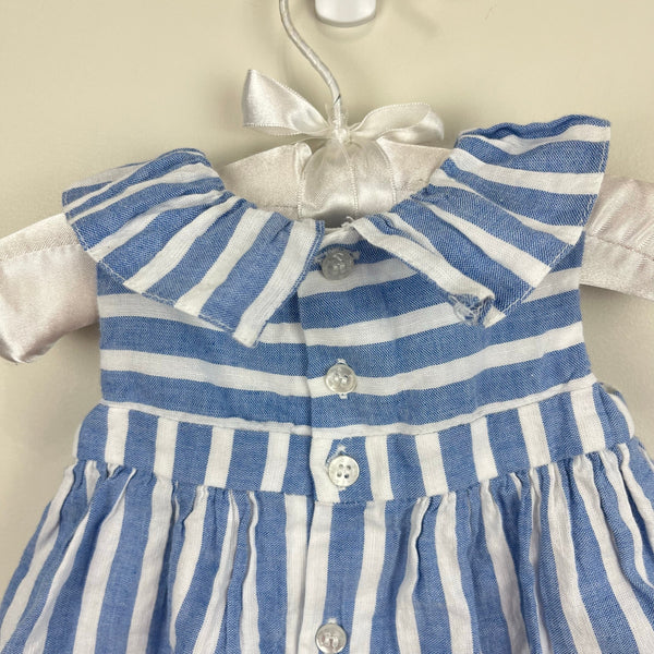 Mayoral Striped Dress Denim Blue and White. Baby girl size 70 cm (US 4-6 months). Elegant sleeveless dress in blue and white striped with ruffle collar. Fully lined. Buttons in the back.