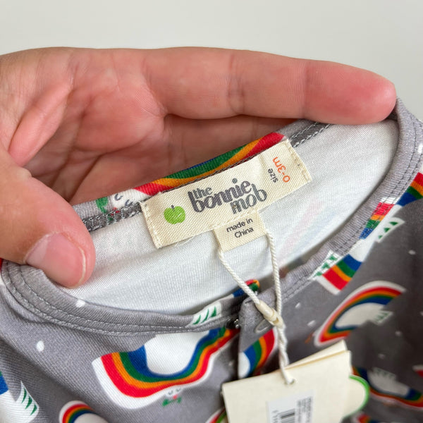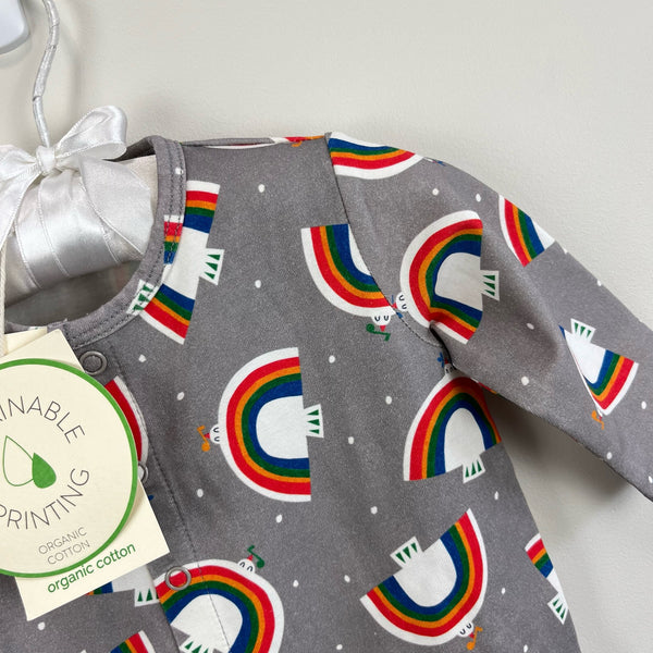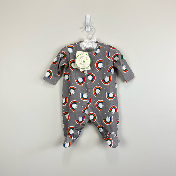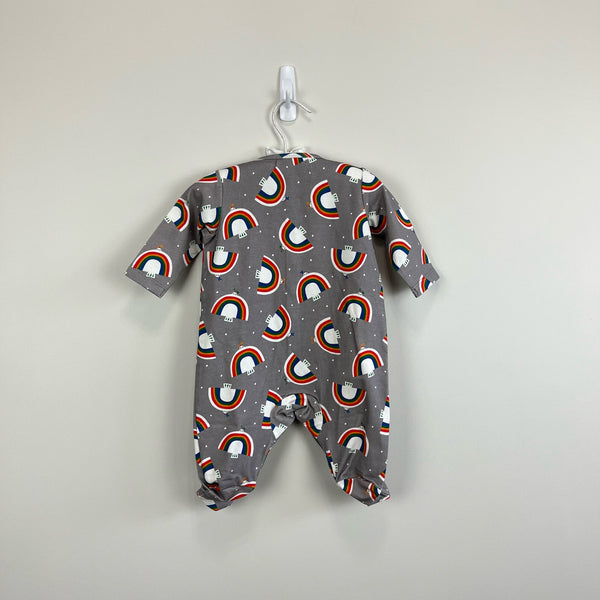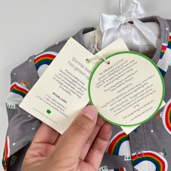 The Bonnie Mob Baby Dreamer Sleepsuit Gray Dove. Unisex baby boy or girl size 0-3 months. Brand new with tags (NWT). Super soft organic cotton. One piece footed outfit is perfect for sleep or play! Snaps down the center. Fun rainbow print.