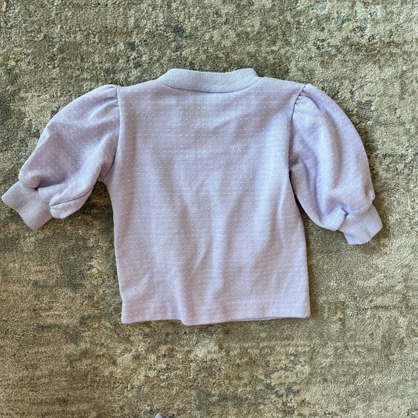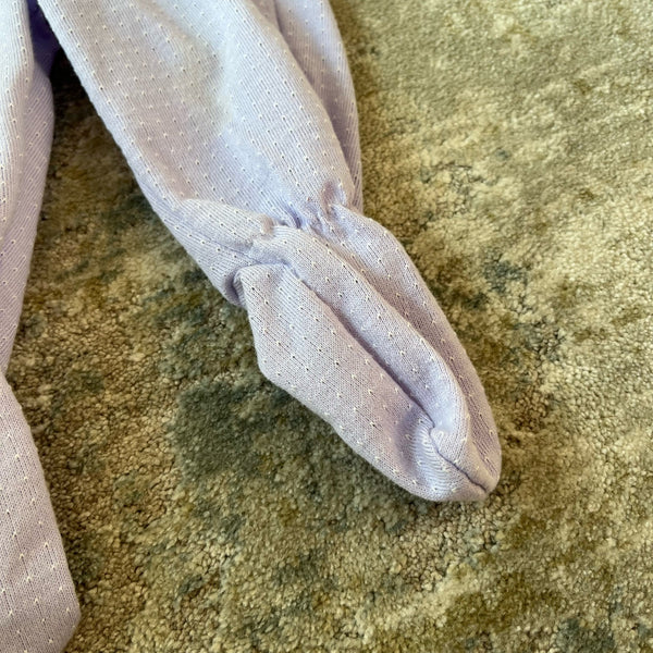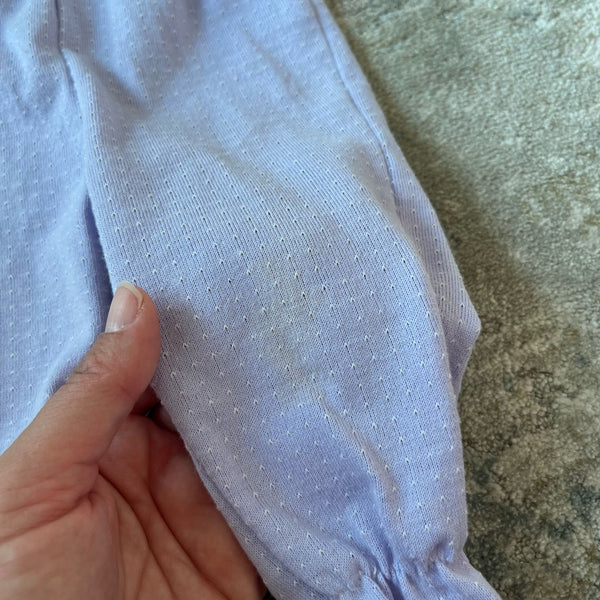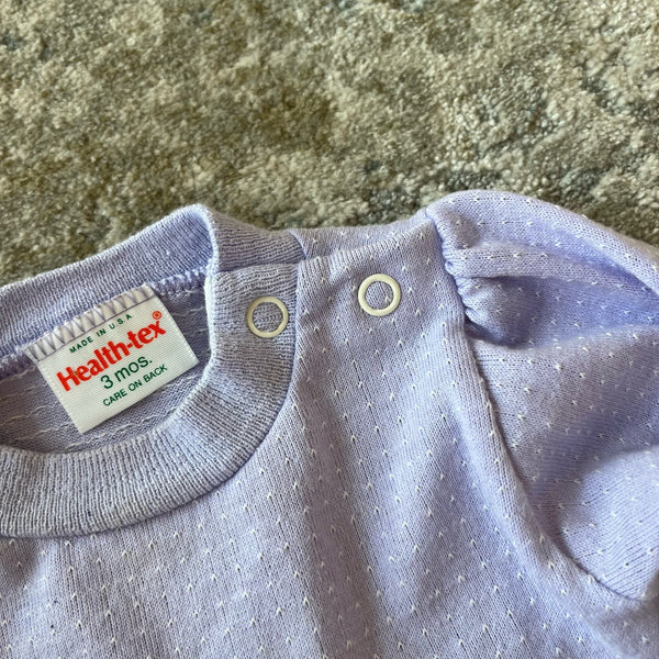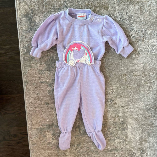 Vintage Health-tex Purple Rainbow Two Piece Set. Baby girl size 3 months. Outfit includes long sleeve light purple top and matching elastic waist footie pants that button together! Adorable applique girl and rainbow on the shirt. Buttons on the shoulder. Super faint mark on pant leg, but otherwise great condition!