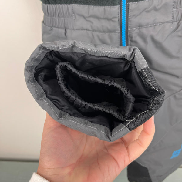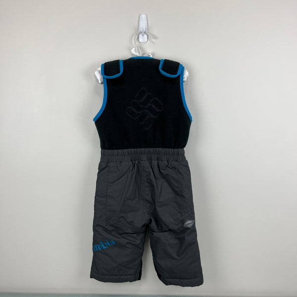 Columbia Boys Logo Omni-Tech Snow Bib Overalls. Baby toddler boy size 18 months. Snow suit pants have soft fleece top, elastic waist, and center zipper for easy on/off. Adjustable velcro snaps. Elastic snow gaiters to keep out cold and snow. ID label inside. Black, gray, and blue. Features waterproof, breathable Omni-Tech insulation.