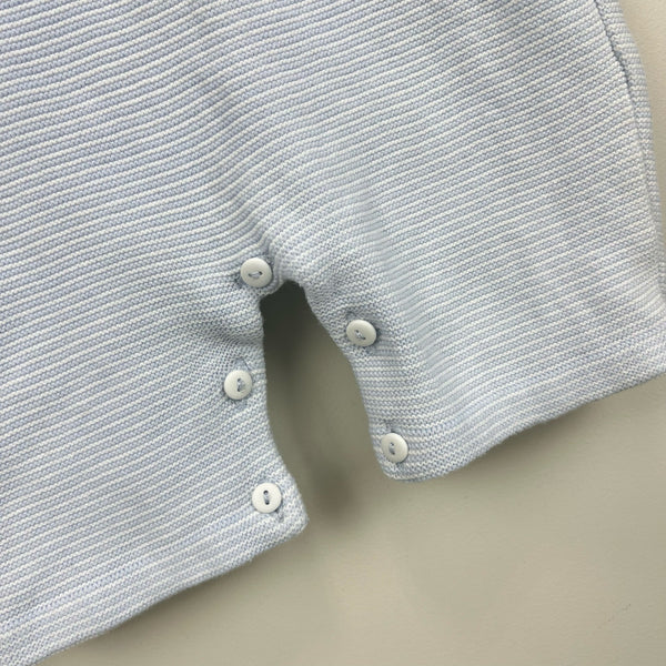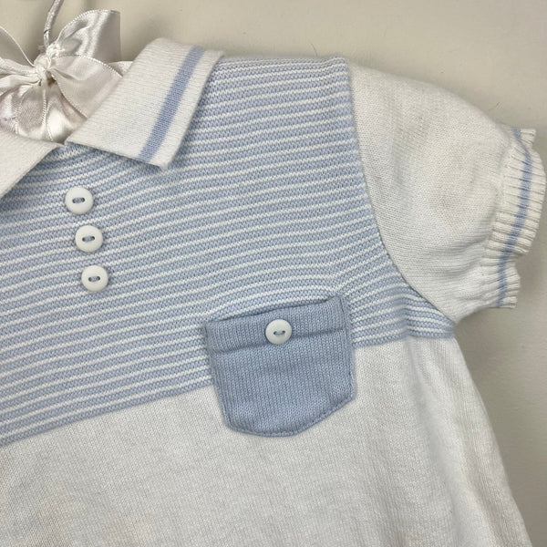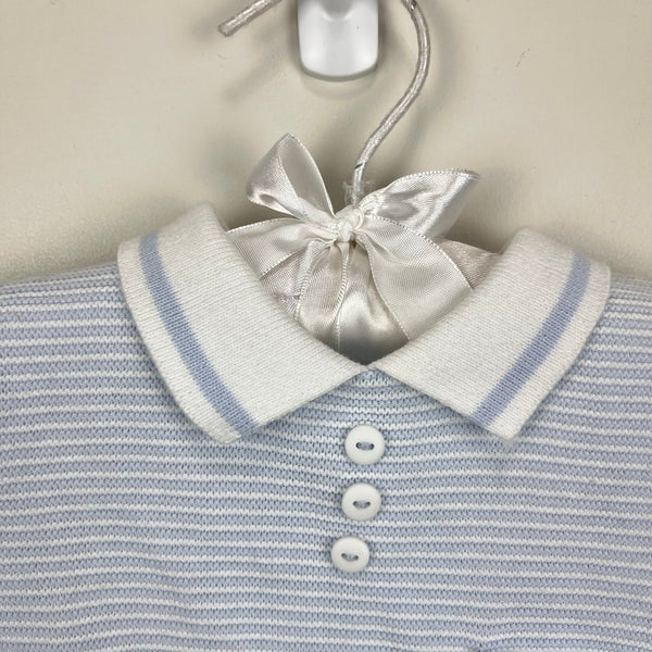 Sarah Louise England Knit All In One Romper. Baby toddler boy size 18 months. Collared blue and white striped one piece shortall outfit. Cozy sweater material. Buttons down the back and along the legs.