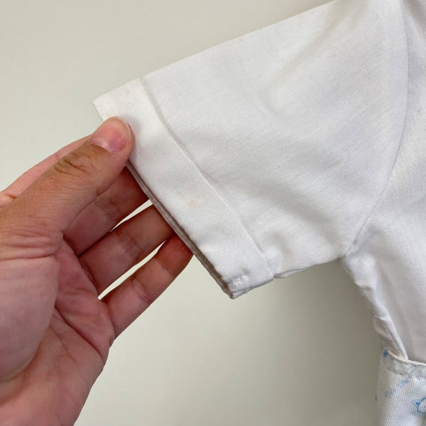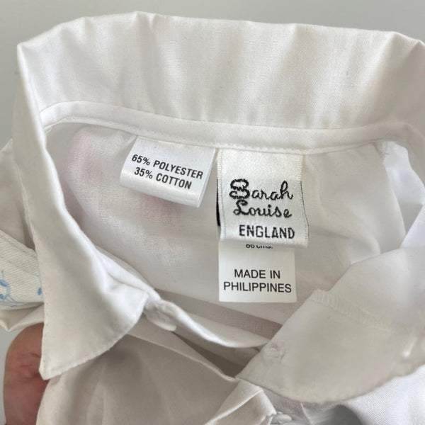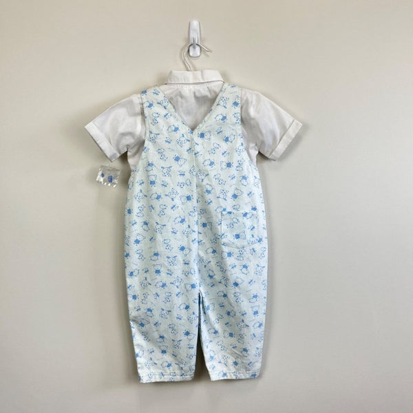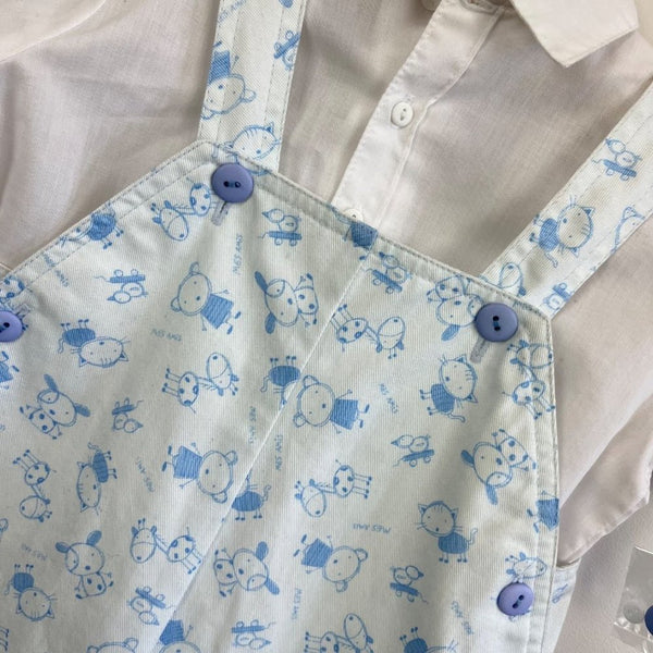 Sarah Louise England White Blue Animal Print Overalls Set. Unisex baby toddler boy or girl size 18 months. Brand new with tag (NWT), though does have light marks on shirt from storage and will need a quick wash before wearing (see photo). Adorable overalls with sketched cats, dogs, giraffes, and more. Button straps and snaps along the legs. Includes short sleeve button up shirt as well for a dressy look.