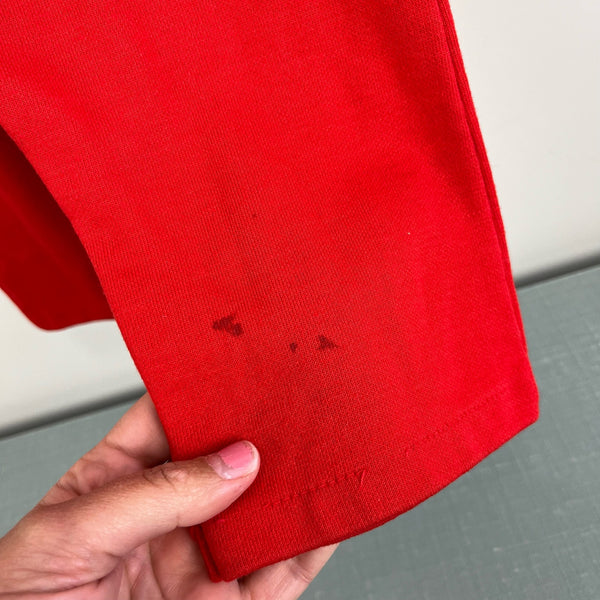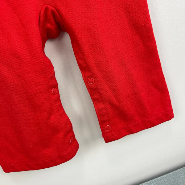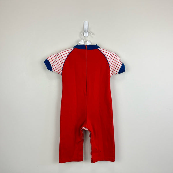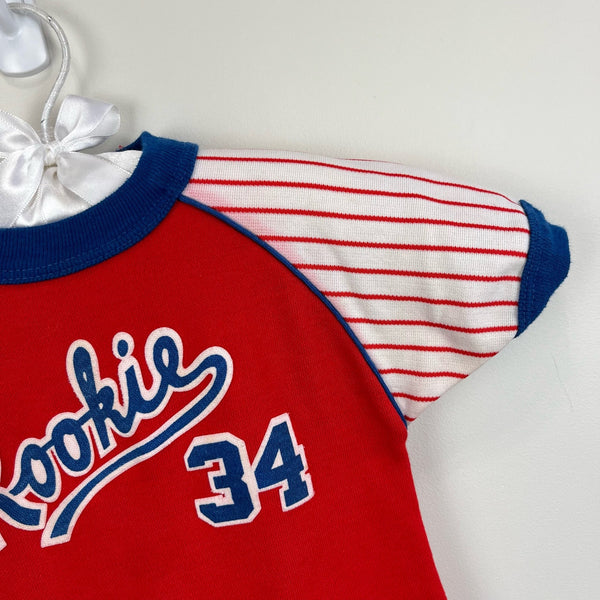 Vintage Carter's Red Rookie Coverall. Baby toddler boy size 18 months. USA made. One piece romper outfit with short sleeves top and long pants bottom. Baseball design with striped sleeves, blue cuffs, and "Rookie 34" on the chest. Zipper in the back and snaps along the legs. Marks on the leg (see last photo; untreated).
