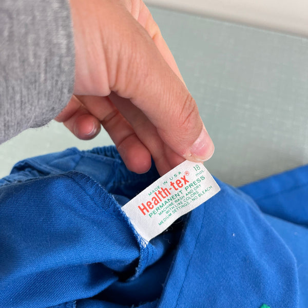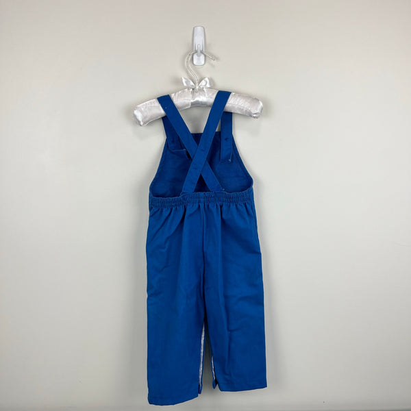 Vintage Health-tex Applique Airplane Overalls. Baby toddler boy or girl size 18 months. USA made. Cobalt blue overalls with red, yellow, and green planes on the bib. Button straps, snaps along the legs, and elasticized waist.