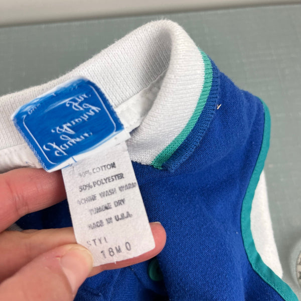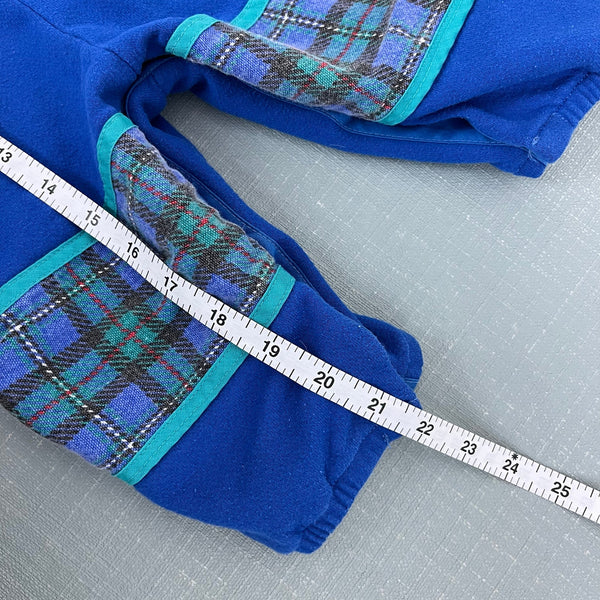 Vintage Jayne Avery Inc Blue Coverall. Baby toddler boy size 18 months. USA made. Cozy one piece outfit designed to look like overalls and a top. Blue with fun 90s plaid patches at the knees. Collared with button placket, pockets, and snaps along the legs.Typical wear due to age including relaxed elastic at ankles.