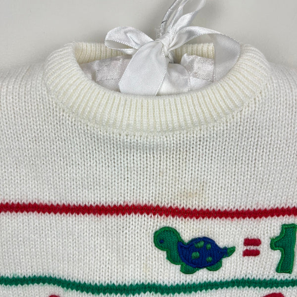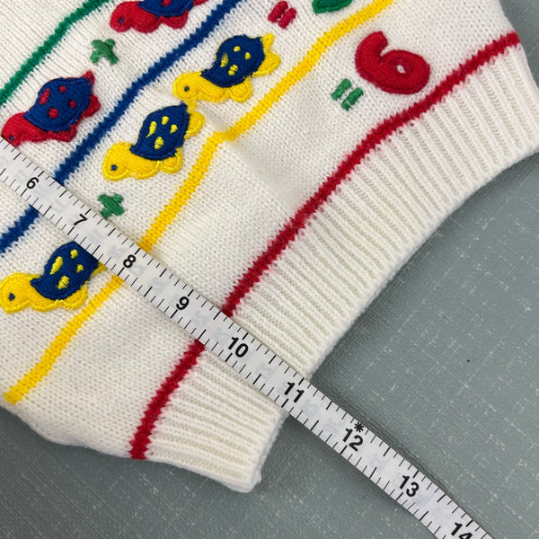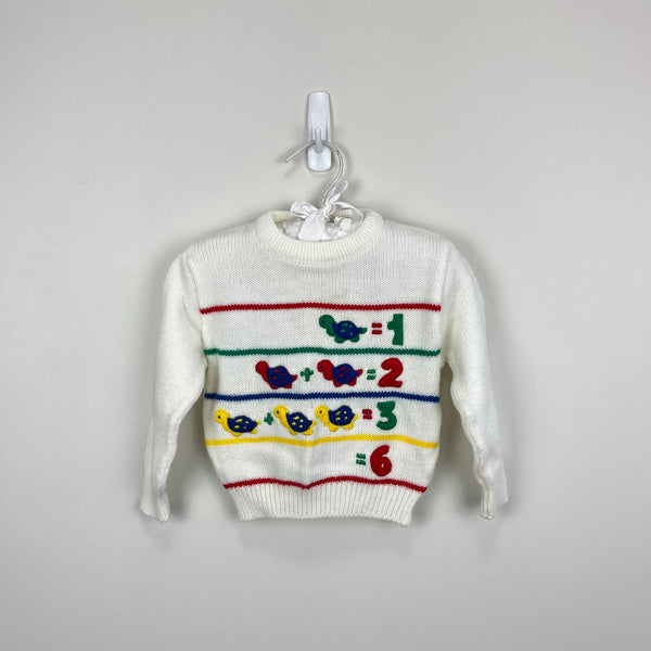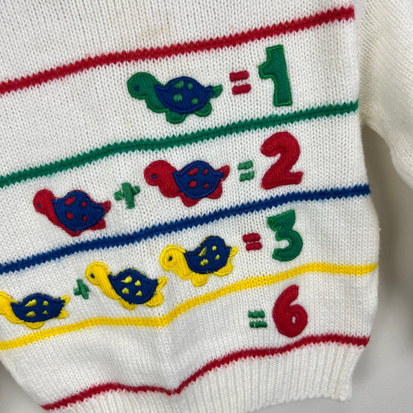 Vintage Top Trend Turtle Number Sweater. Baby toddler girl or boy size 18 months. Knit crewneck pullover with primary colored stripes and turtles. Do the math and one green turtle, two red turtles, and three yellow turtles equals 6! Faint marks near neck (see photo; untreated). So cute for preschool photos!