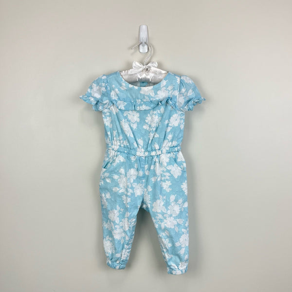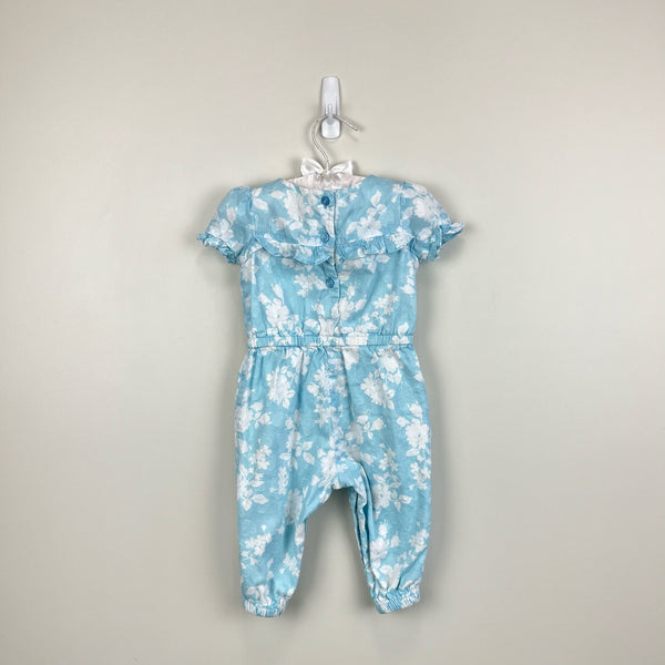 Janie and Jack Floral Jacquard Jumpsuit Sky Blue Floral. Baby toddler girl size 12-18 months. Dress one piece, short sleeve pants romper. Pretty blue and white flower print with ruffles. 100% Cotton Jacquard. Fully lined. Features front pockets, button back, snaps along the legs, and elasticized waist.