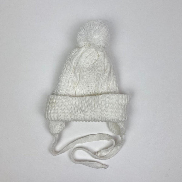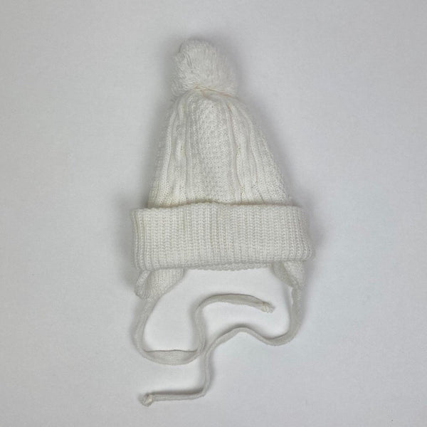 Vintage Just Friends Girls 90s Knit White Pom Pom Hat. Cozy winter hat with ear flaps and fluffy pom pom on top. Has some light, but untreated spots. Please see photos for measurements; fits about 12-24 months.