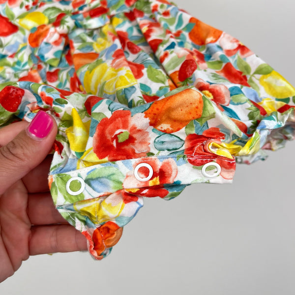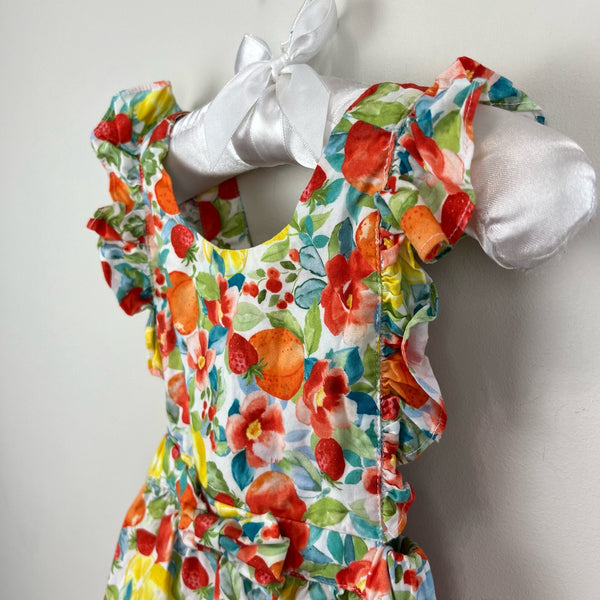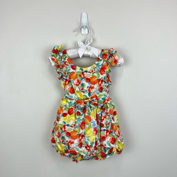 Luli & Me Ruffle Fruit Sunsuit Romper. Baby toddler girl size 18 months. One piece bubble outfit is perfect for summer! Button straps with ruffles and a bow at the front. Snaps at the bottom. Colorful print with fruits and flowers.