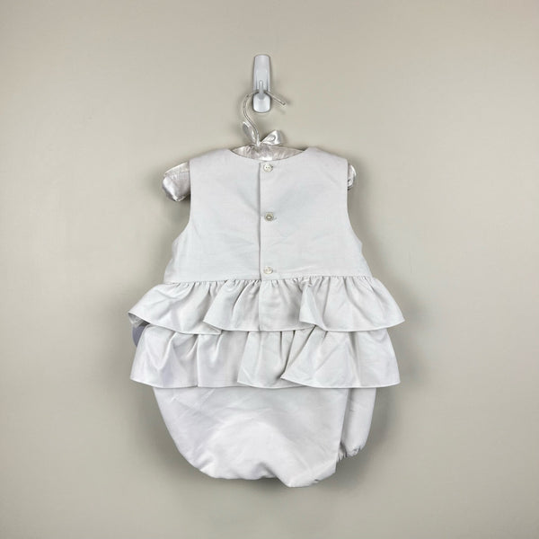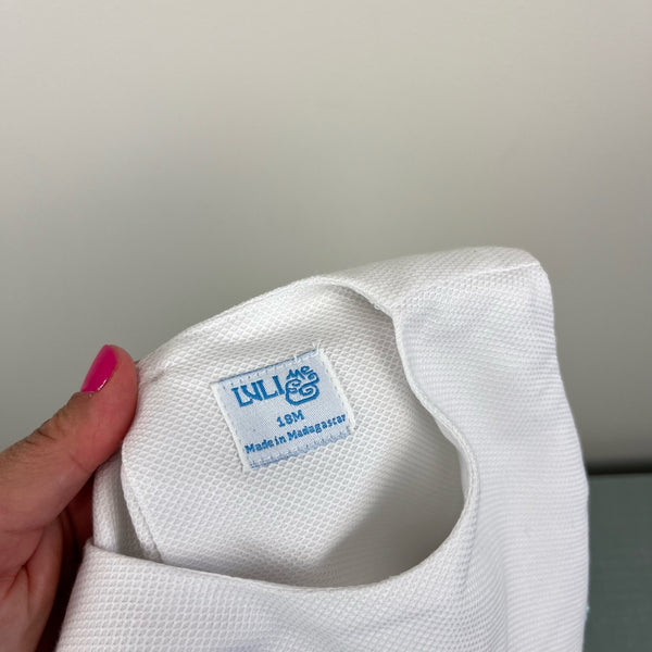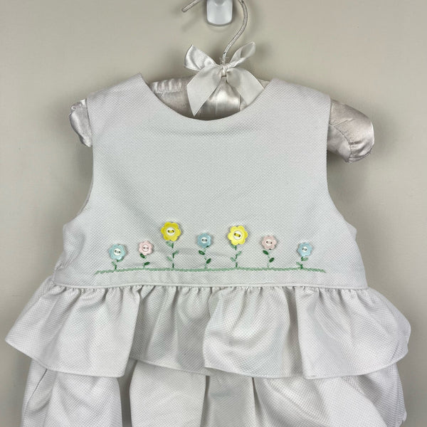 Luli and Me Ruffled White Flower Romper. Baby toddler girl size 18 months. Brand new with tags (NWT). Sleeveless one piece bubble outfit with layered ruffles around the waist. Buttons in the back and snaps at the bottom. Embroidery and decorative pastel flower buttons on the chest.