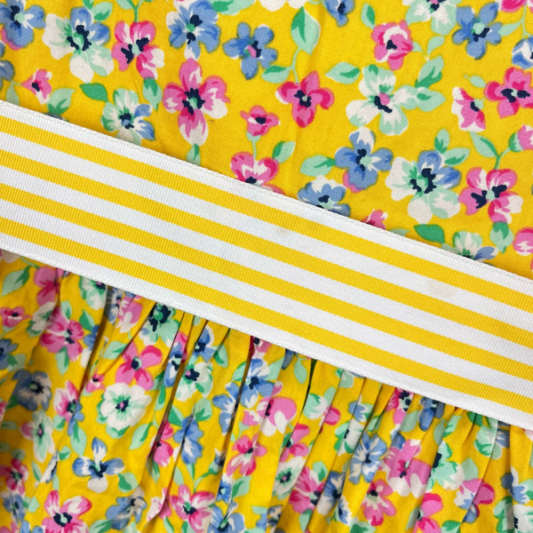 Ralph Lauren Girls Yellow Floral Dress. Baby toddler girl size 18 months. Short sleeve top and nice full skirt bottom. Buttons in the back. Preppy yellow with blue and pink flower print. Striped sash to tie a bow in the back. Includes matching diaper cover. Light mark on sash (see photo; untreated), but otherwise excellent condition. Perfect for a party or other special occasion!