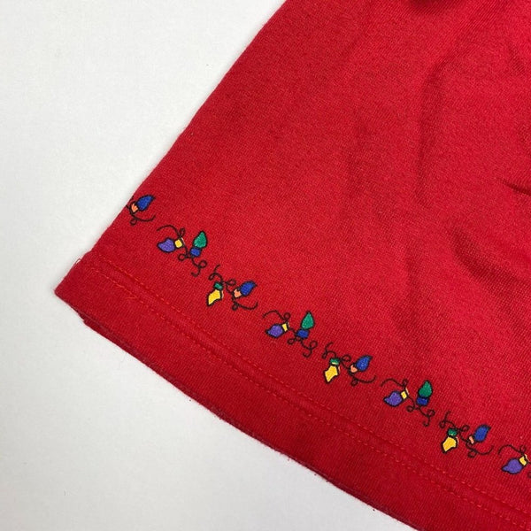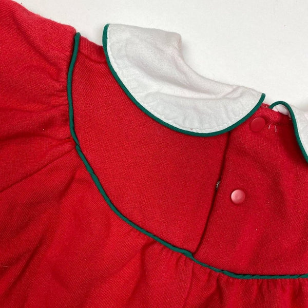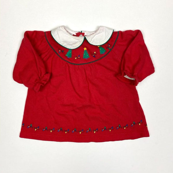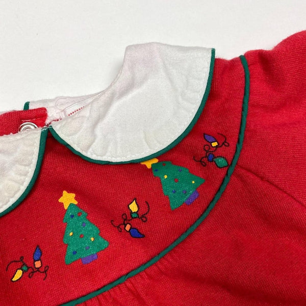 Vintage All Mine Red Christmas Dress. Baby toddler girl size 18 months. Cozy long-sleeve casual dress for the holiday season. Features white peter pan collar, green Christmas trees, and festive string of lights along the bottom. Sweatshirt-like feel with typical wash wear; no stains or tears. Would also work as a top with leggings! See photos for measurements.