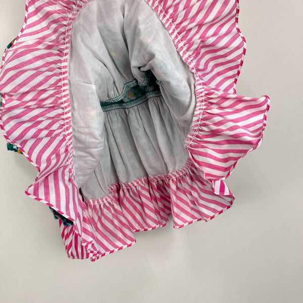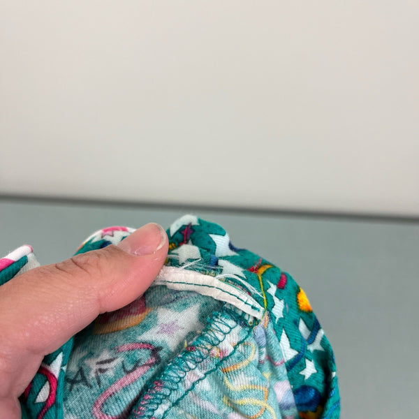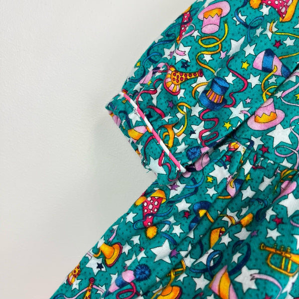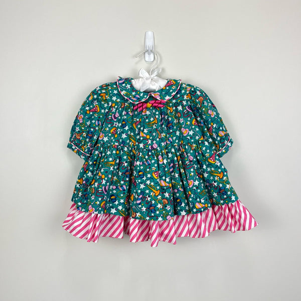 Vintage New Year's Eve Girls Party Dress. Tag cut out, so please check measurements to ensure fit. (Looks around a baby toddler girl size 18 months.) Festive long sleeve green collared dress with pink and white striped ruffle hem, collar, and curly ribbon. bow. Fun print with stars, french horns, party hats, and confetti.