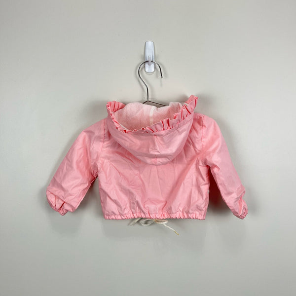Vintage Pink Hooded Spring Jacket. Baby toddler girl size 18 months. Light-weight, hooded full zip coat with ruffles along the hood and ribbon flower design. Elastics in sleeves is good! See photos for measurements.