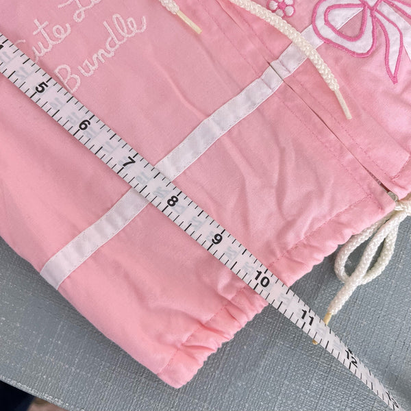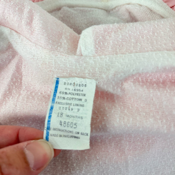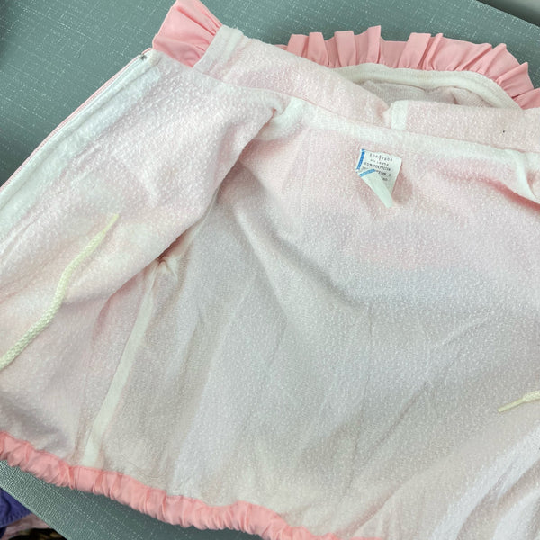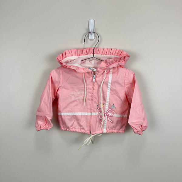 Vintage Pink Hooded Spring Jacket. Baby toddler girl size 18 months. Light-weight, hooded full zip coat with ruffles along the hood and ribbon flower design. Elastics in sleeves is good! See photos for measurements.