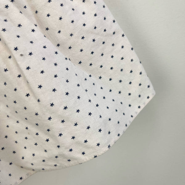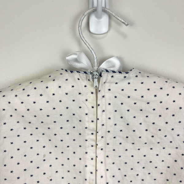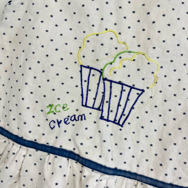 Vintage Polka Dot Star Ice Cream Dress. No tags, so please check measurements to ensure fit. (I'd guess about 18 months as a dress, but you could definitely wear as a top, too as your kiddo grows!). Sleeveless white dress wit navy blue stars and embroidered ice cream cones on the chest. Zipper in the back. Has a few light marks and a loose thread in the ice cream (see photos).