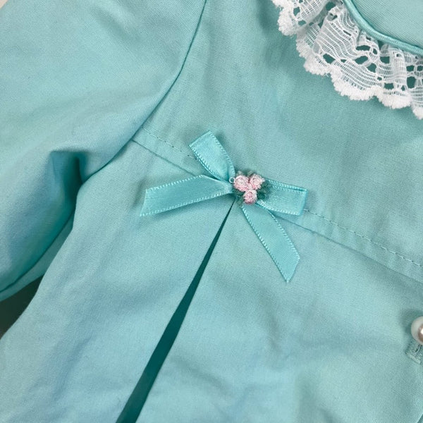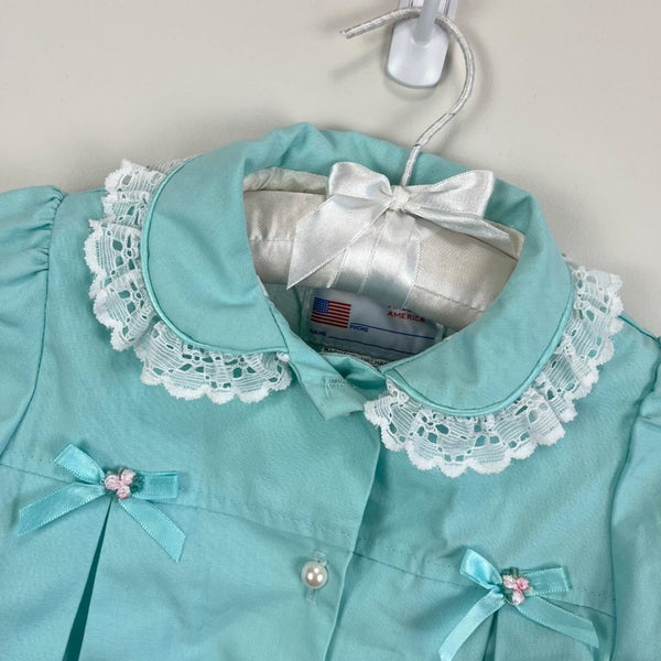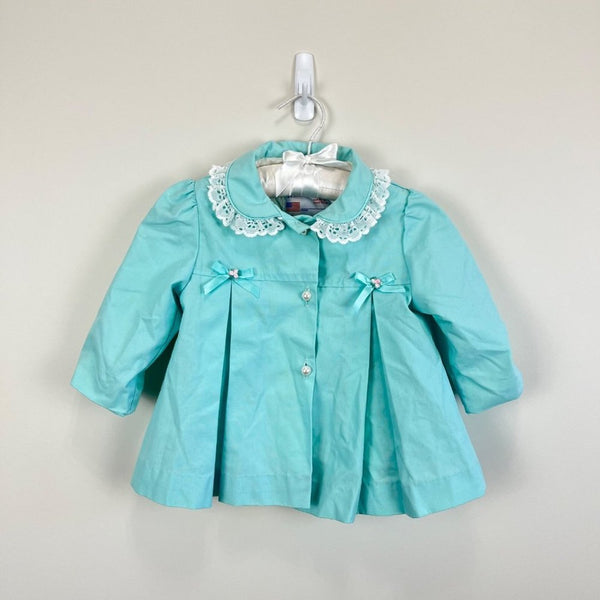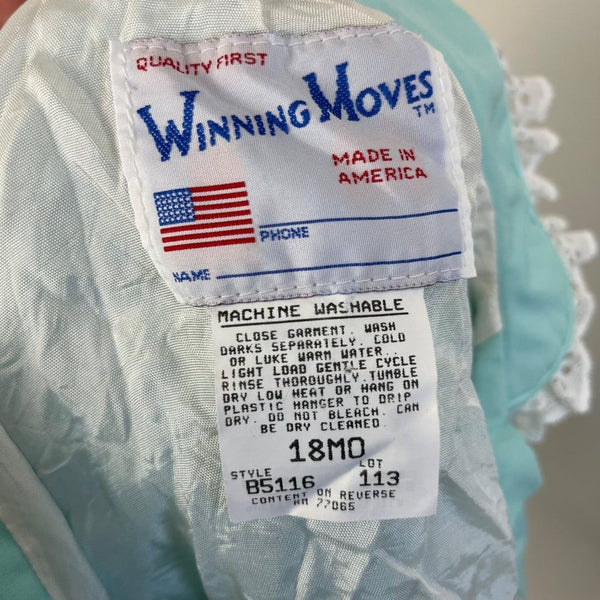 Vintage Winning Moves Dress Coat. Baby toddler girl size 18 months. Made in the USA. Adorable, classy, and timeless style! Pretty sea foam green jacket has white lace accents on the collar, ribbon bows, pleats, and fancy buttons! Fully lined. Light marks on lining (untreated), but overall great condition! Perfect for Easter or another special occasion this spring.