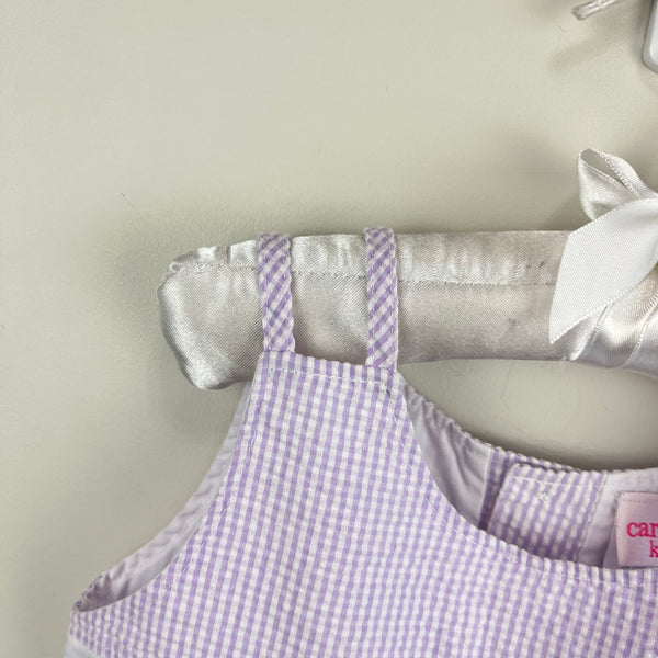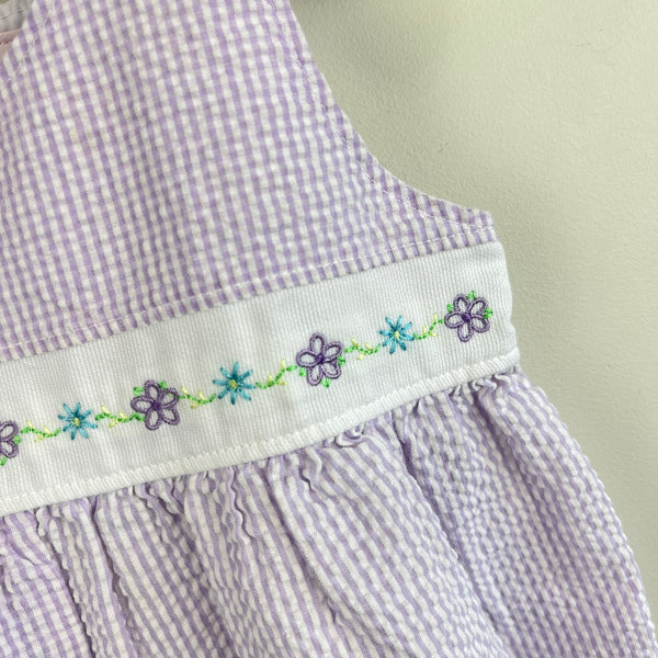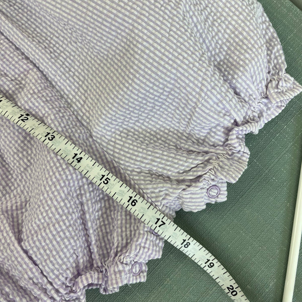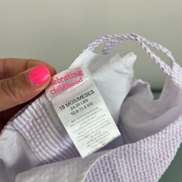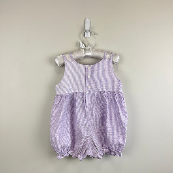 Vintage Y2K Carter's Purple Seersucker Stripe Flower Romper. Baby toddler girl size 18 months. One piece bubble shortall outfit for summer. Purple and white stripes with embroidered flowers at the chest. Elasticized ruffle leg opens and cute double strap detail. Button in the back and snaps at the bottom. Great condition with no flaws noted!