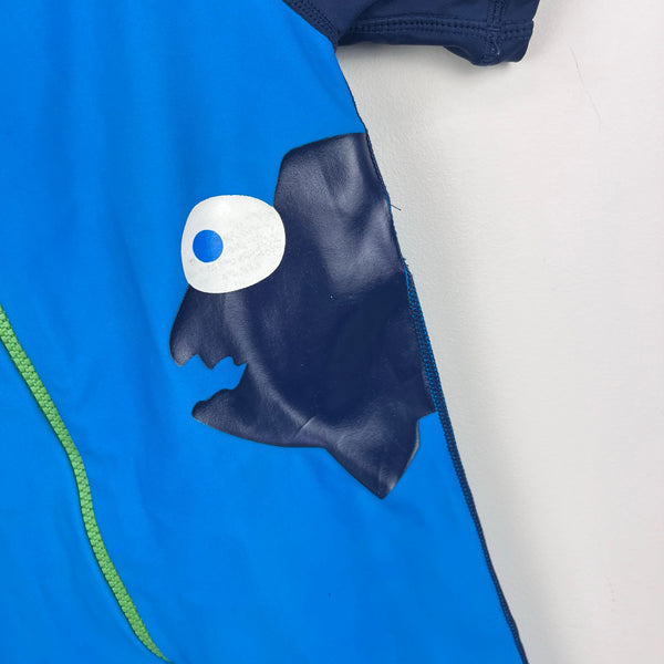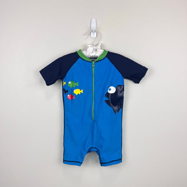 Hanna Andersson Blue Fish Sunblock Rash Guard Bathing Suit. Baby toddler boy size 80 cm (US 18-24 months). One piece swim suit features fast drying, UV protection material designed to hold up in the sun and chlorine. Convenient zipper for easy on/off. Great condition with no flaws noted. Perfect for summer play at the pool or beach!