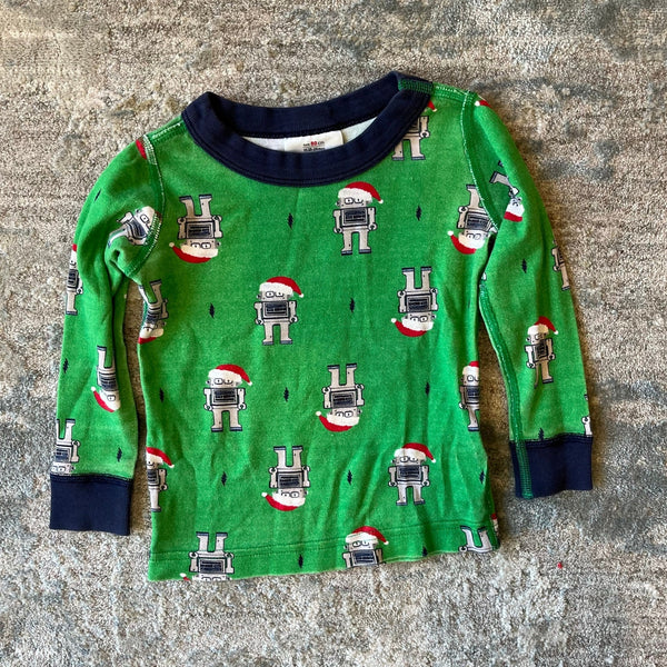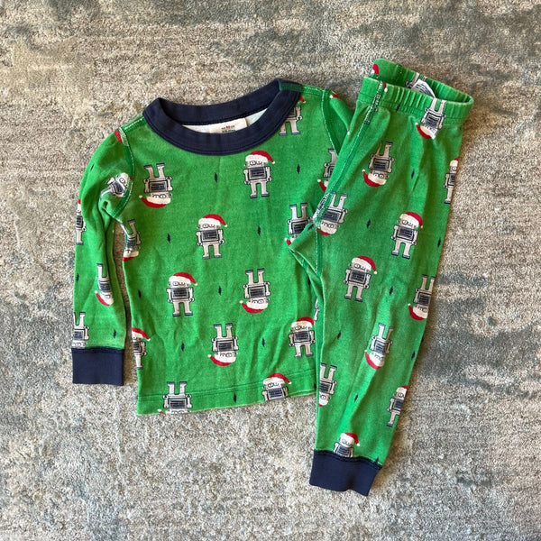Hanna Andersson Green Santa Robot Long John PJs. Baby toddler boy size 80 cm (US 18-24 months). Two piece Christmas pajama set with long sleeve top and pants bottom. Green with robots wearing Santa hats! Light wear at the knees.