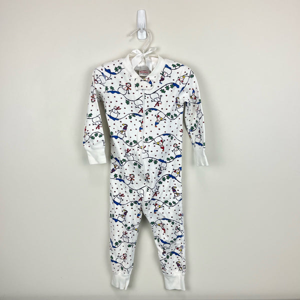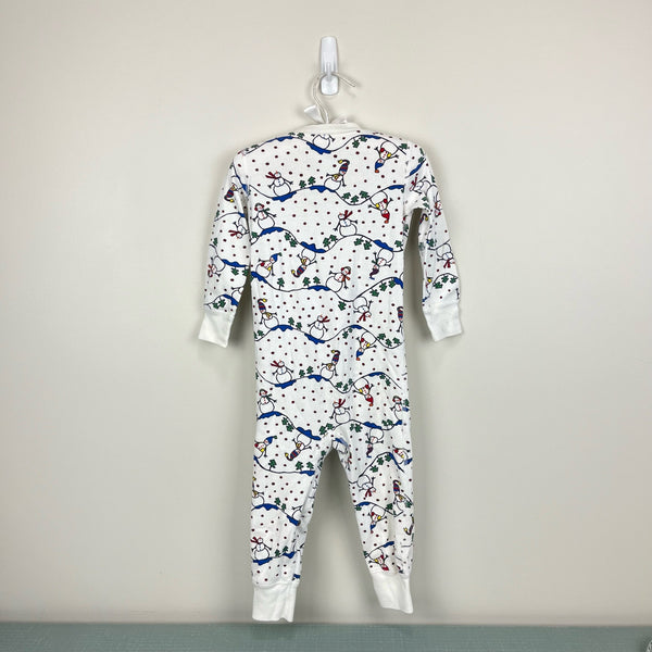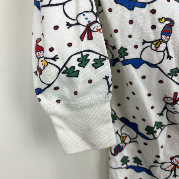 Hanna Andersson Snowman PJs. Baby toddler boy or girl size 80 cm (US 18-24 months). Cozy, fitted one piece organic cotton sleeper. White with trees, snowmen, and falling snow.