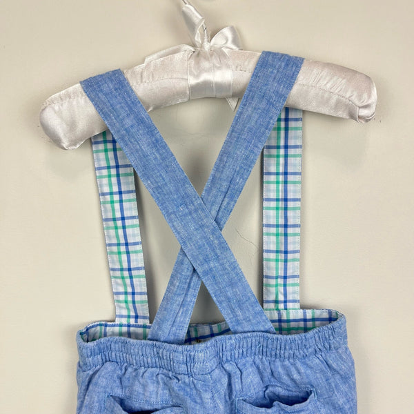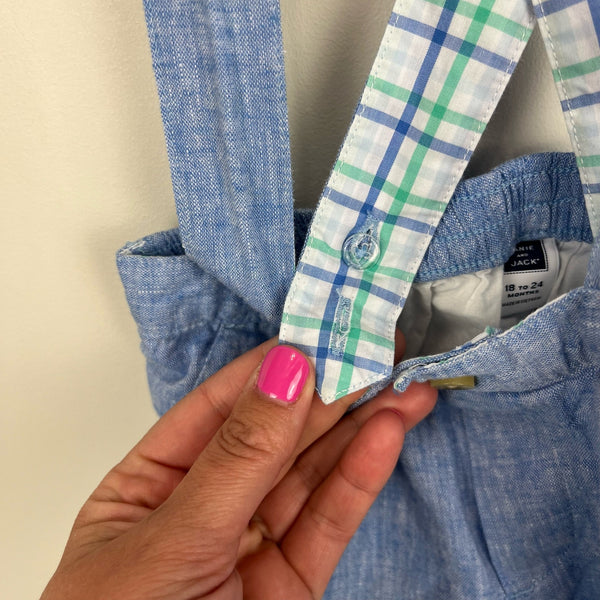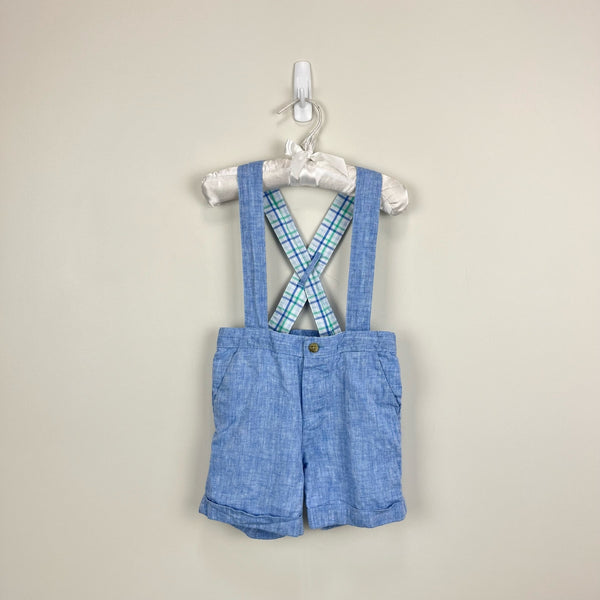 Janie and Jack Chambray Blue Suspender Shorts. Baby toddler boy size 18-24 months. months. Light blue dress shorts with overalls style straps are perfect for a special occasion in spring or summer! Two button holes to adjust the length. Linen cotton blend. Lined. Coordinating shirt available separately.