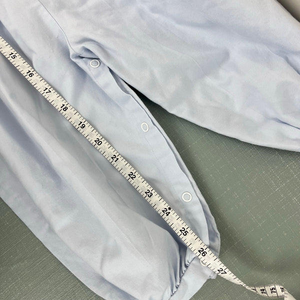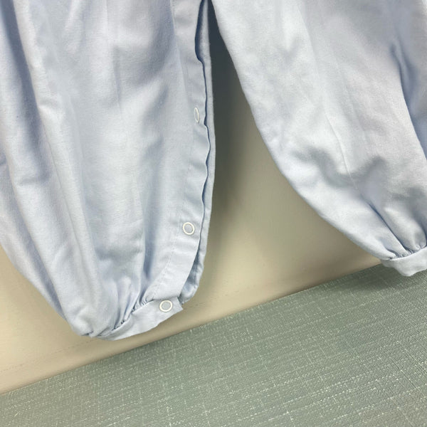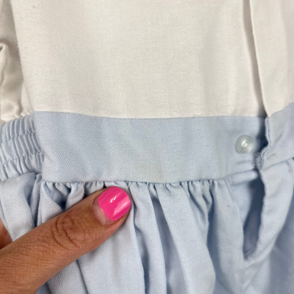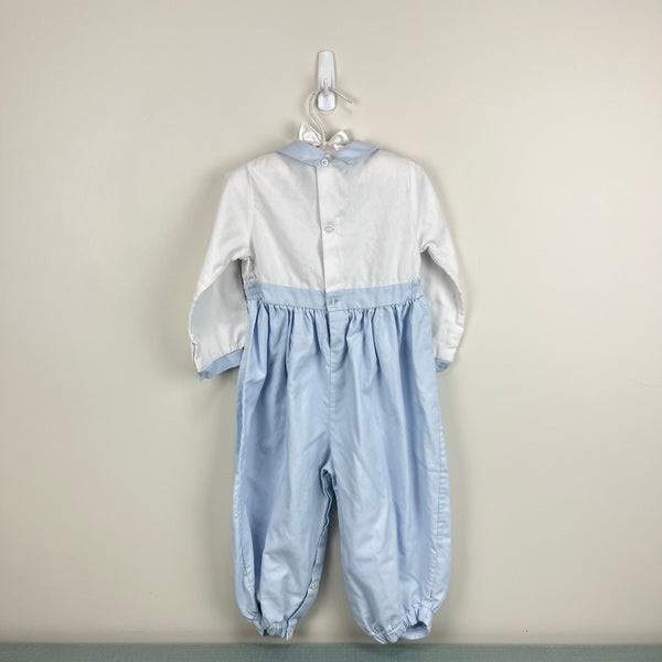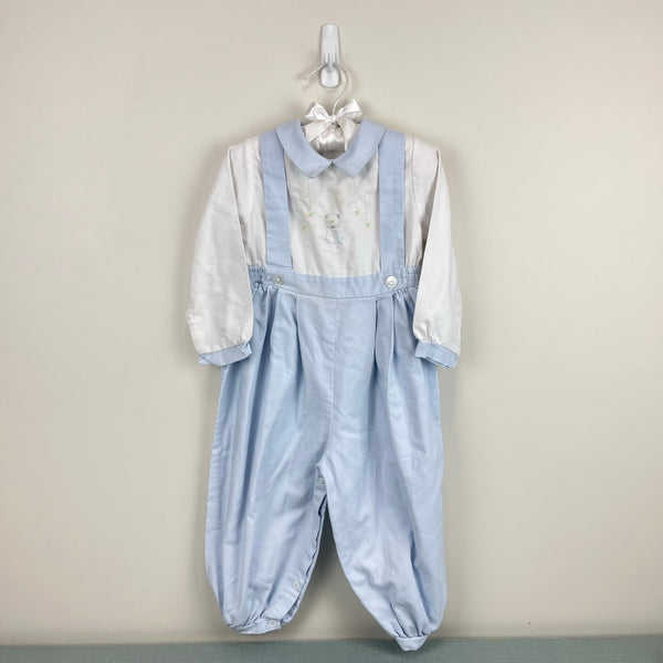 Vintage Rosey Kids Embroidered Blue White Outfit. Baby toddler boy size 24 months. One piece coverall designed to look like long sleeve collared shirt top and dressy pleated suspender pants bottom. Elasticized waist, buttons in the back, and snaps along the legs. Embroidered bear on the chest. Has some assorted light marks (see photos; untreated).