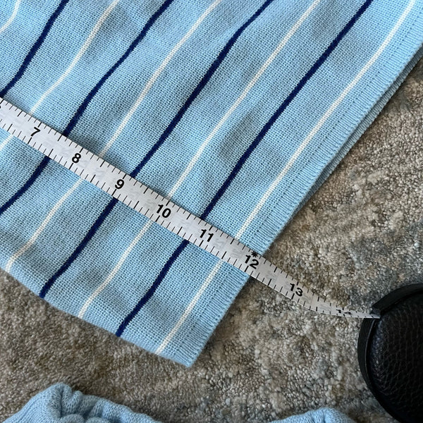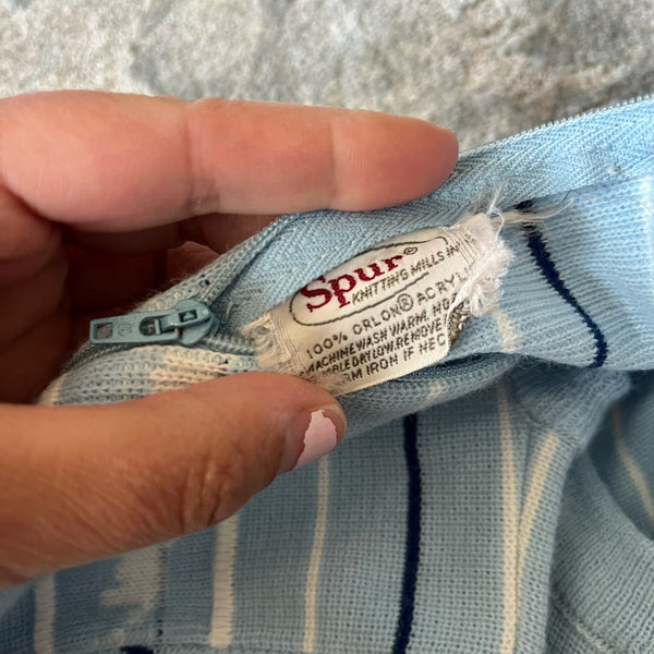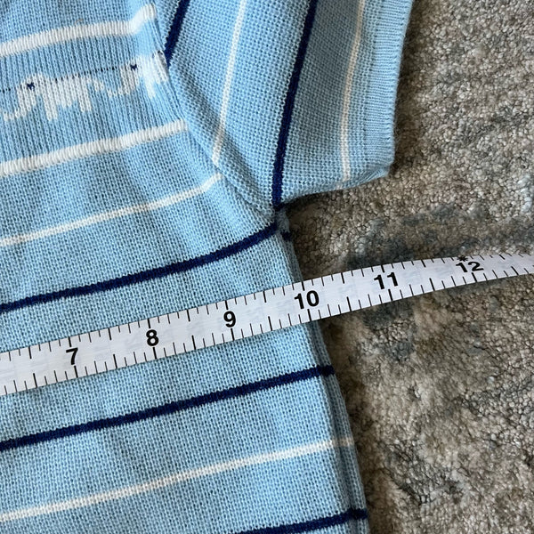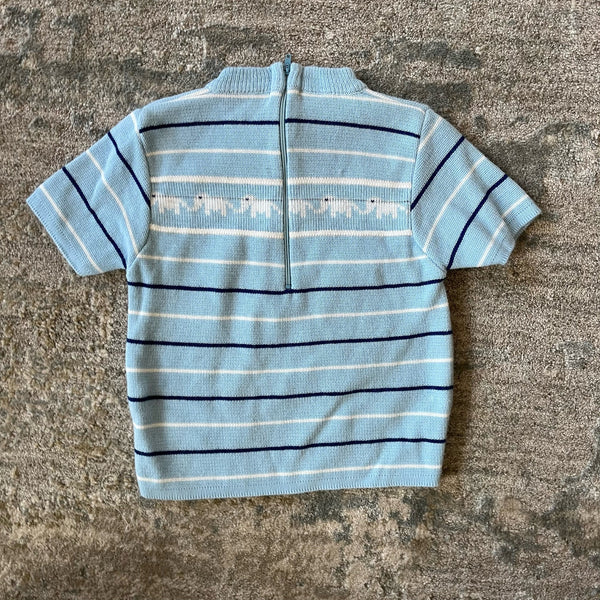 Vintage Spur Knitting Mills Sweater Set. No size on tag, so please check measurements to ensure fit. (Looks around 24 months, but fit is definitely flexible since it's two pieces.) Includes short sleeve blue and white striped top with elephants and matching bloomers. Great condition!