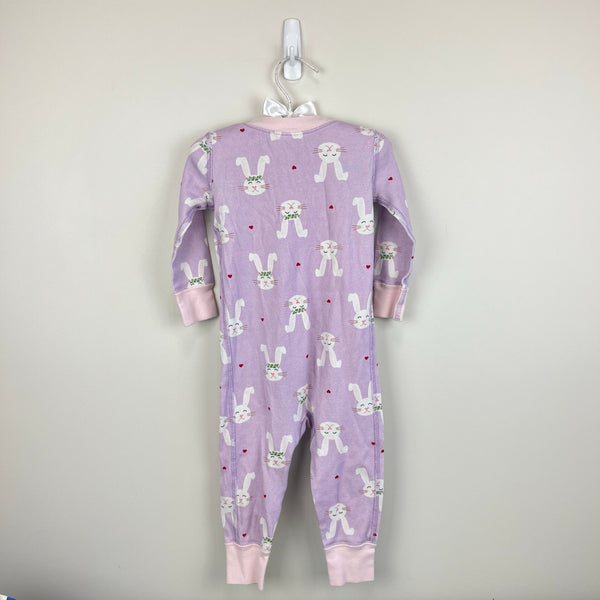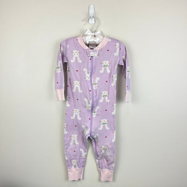 Hanna Andersson Bunny Rabbit PJs. Baby toddler girl size 80 cm (US 18-24 months). Cozy organic cotton one piece sleeper. Pretty lilac purple color with hearts and bunnies wearing flower crowns. Light wear; no stains, tears, etc. Perfect for spring!
